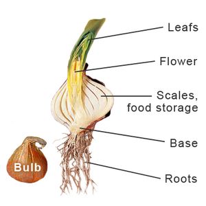 It's that time of year again! Bulb planting time! While some flowers are grown from seeds in the spring and summer, other plants start out as a bulb. A bulb is an underground storehouse and flower factory. Within the bulb is just about everything the plant will need to sprout and flower at the appropriate time. Bulbs planted in autumn must go through a significant cold period (winter) before they will flower in the spring. Cut open a bulb and this is what you'd find: